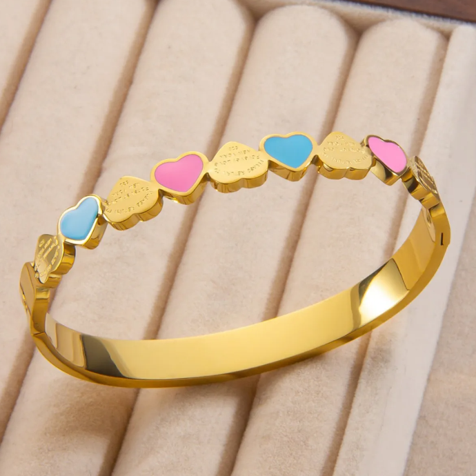 Pieza de acero 316L doble laminado en oro 18K con un acabado impecable que realza su carácter lujoso. Este bangle, posee incrustaciones de Cristal K9 GLASS, ofrece un brillo inigualable y colores intensos que perduran a lo largo del tiempo.